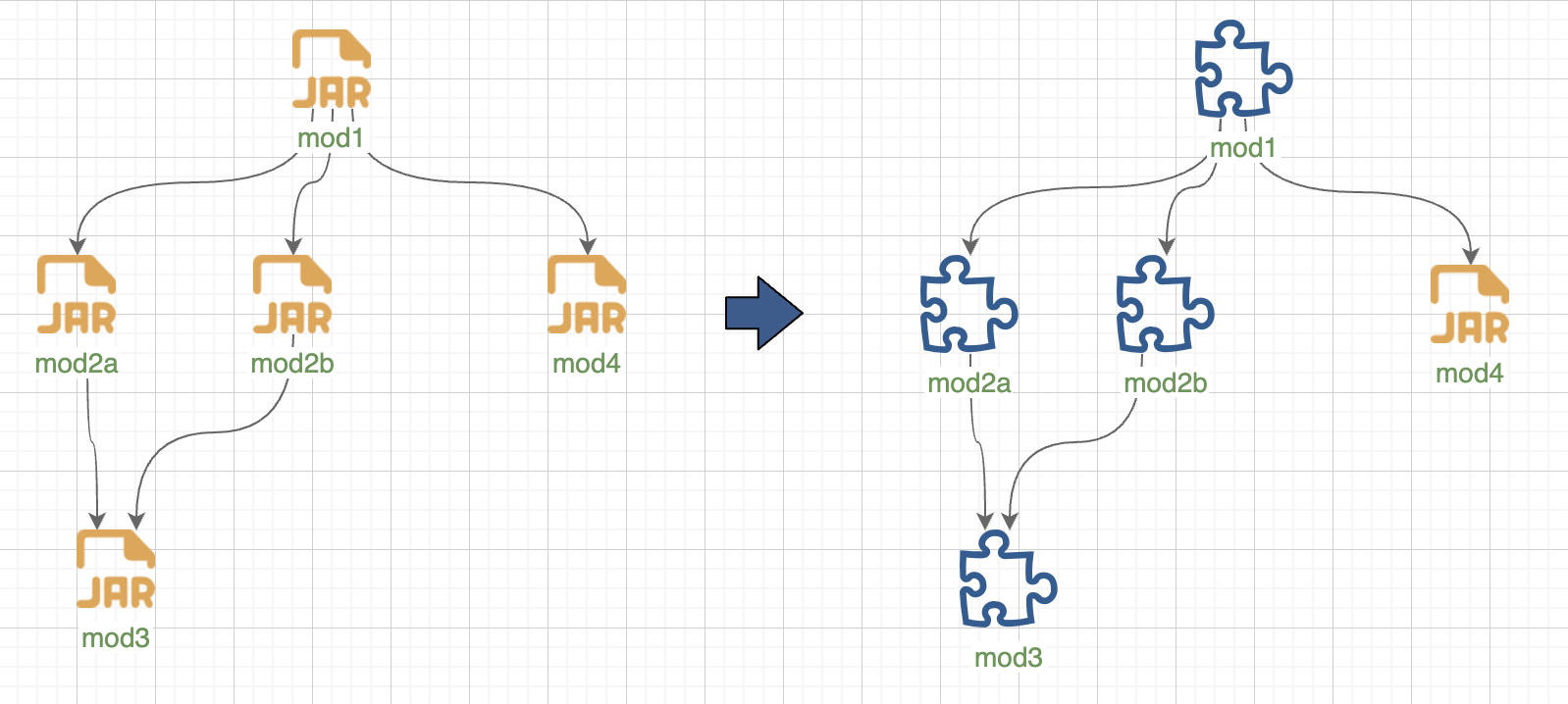 还是以示例工程为例,假设 mod4 是一个第三方 jar 包,无法进行模块化改造,那么最终改造完之后,虽然应用运行命令和之前一样还是java -p mod1.jar:mod2a.jar:mod2b.jar:mod3.jar:mod4.jar -m mod1/mod1.EventCenter,但其中只有 mod1、mod2a、mod2b、mod3 是真正的模块,mod4 未做任何改造,借由模块系统转为自动模块。