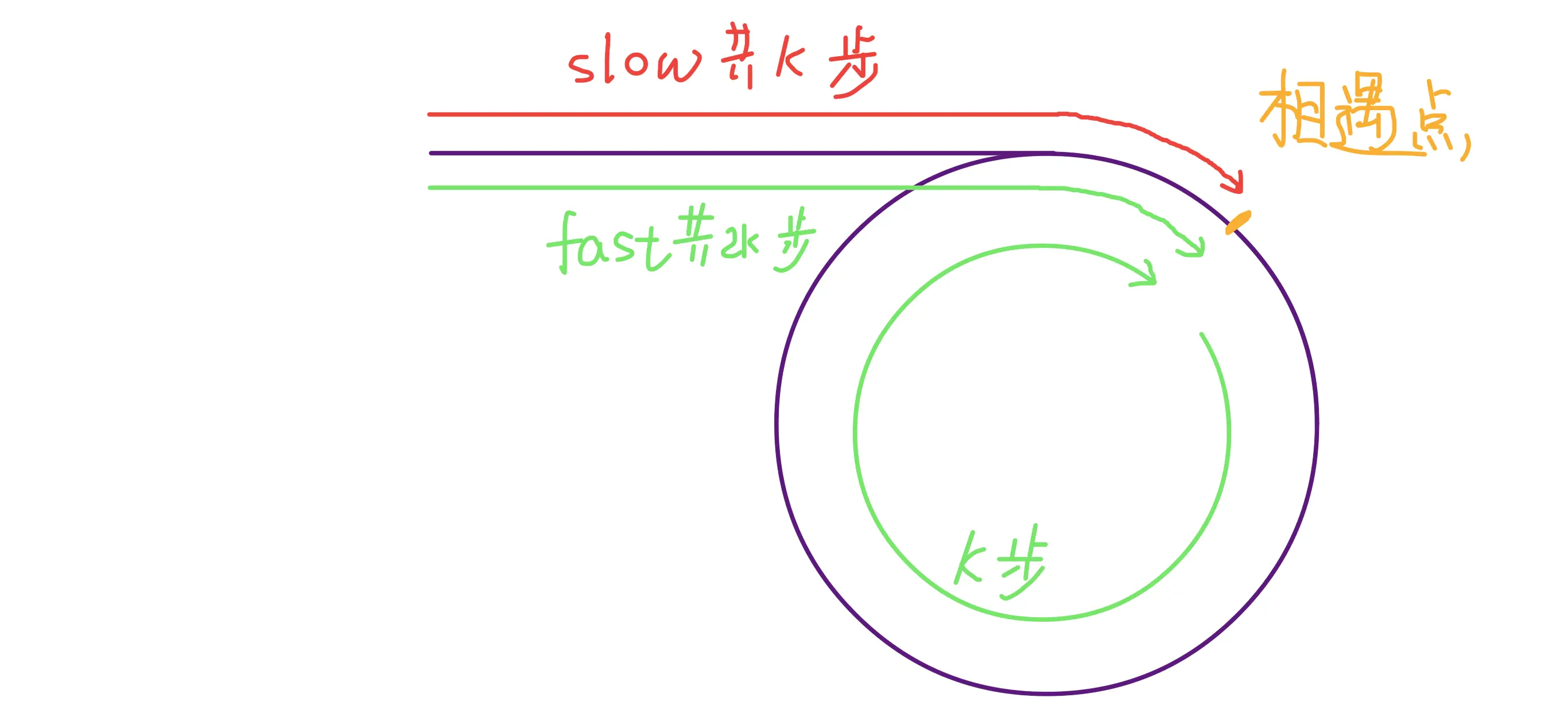 第一次相遇时,假设慢指针 slow 走了 k 步,那么快指针 fast 一定走了 2k 步,也就是说比 slow 多走了 k 步(也就是环的长度)。