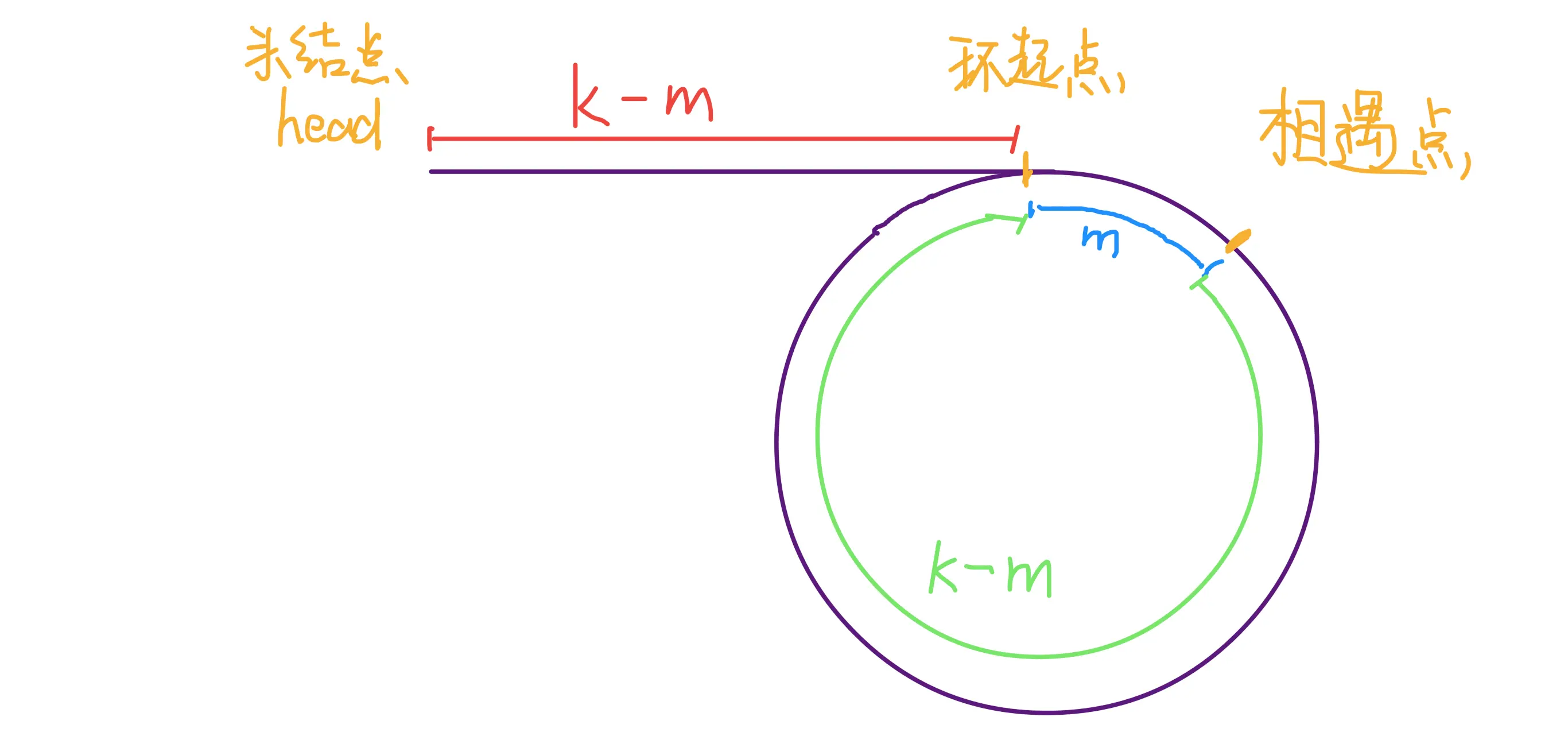 巧的是,如果从相遇点继续前进 k - m 步,也恰好到达环起点。