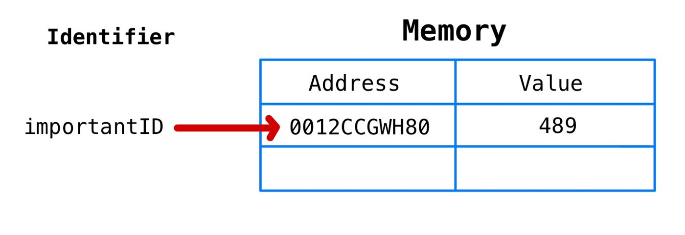 当声明 importantID 变量之后,某一块内存空间被分配出去,用于存放 489 这个值。牢记我们之前所说的,变量 importantID 从来只等于某一个内存地址。