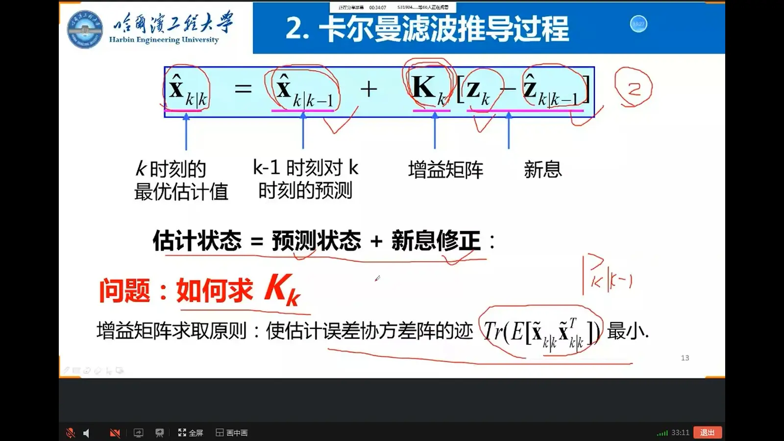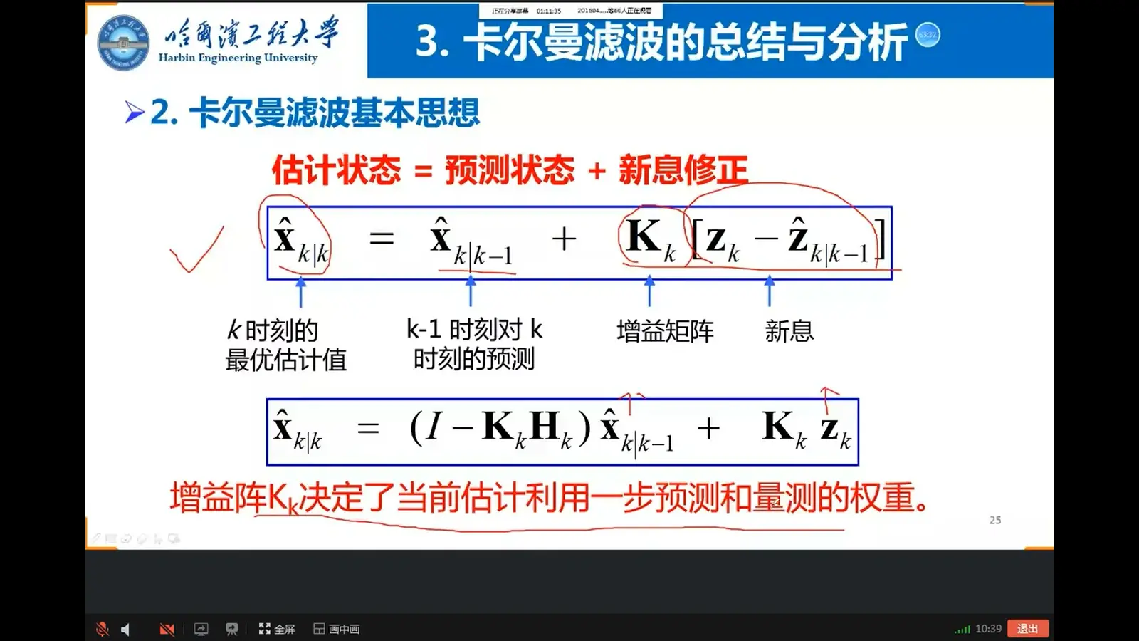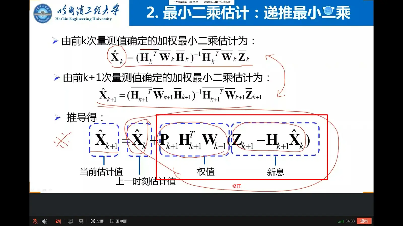 - 如上式,当前估计=上一时刻估计+修正,修正=权重×新息