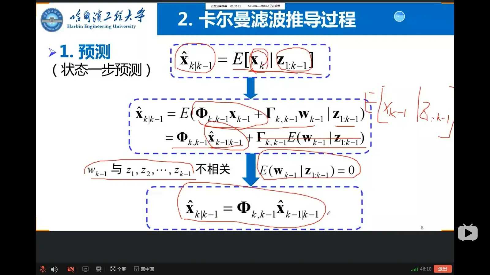 问题一:若是非平稳随机过程,(一阶矩和二阶矩等统计特性会随着时间的变化而变化),上一时刻的统计特性知道了,有方法去求下一时刻的统计特性?---通过卡尔曼滤波的多出来的一个状态方程来迭代求解