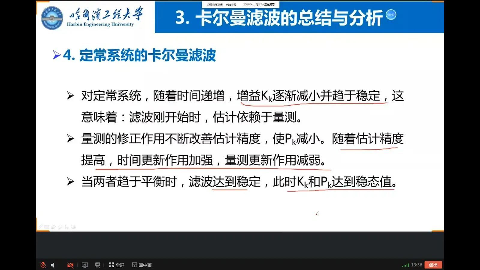 - 问题一:若是非平稳随机过程,(一阶矩和二阶矩等统计特性会随着 时间的变化而变化),上一时刻的统计特性知道了,有方法去求下一时刻的统计特性?---通过卡尔曼滤波的多出来的一个状态方程来迭代求解