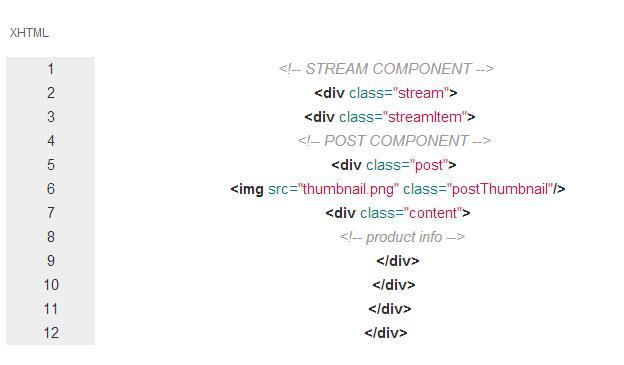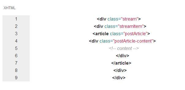 通过这些代码,你可以立即识别出它们的结构、功能和含义。父节点的类名是 stream ,内容是一个文章列表。它的子节点的类名是 streamItem ,内容是文章列表中的一篇具体的文章。这使我们很容易的了解到父节点和子节点之间的关系。并且,这些类可以在每一个有文章功能的页面中使用。