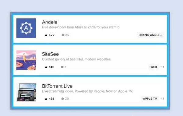 在这个充满了组件库(以 React 为例)的时代,模块化就是王者。组件就是由已经解构了的接口创建的可组合的模块。下面是一个Product Hunt(一种发布好的创业项目的网站)前端页面。作为练习,让我们将这个页面分解成一系列的组件。