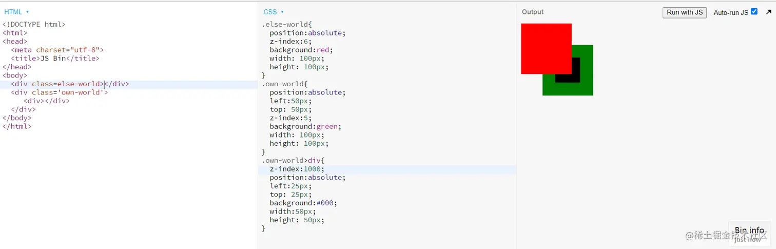 实验:如上实例中.own-world元素由于z-index的等级没有.else-world高,所以就算子元素拥有z-index:1000优先级也不会超过.else-world,因为那只不过是在own-world的小世界中拥有较高的优先级。这就是层叠上下文
