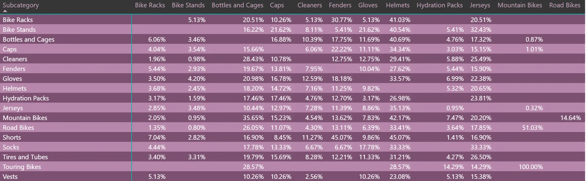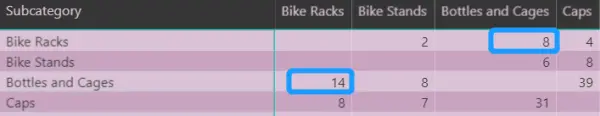 如你所见,首先购买公路自行车的顾客中,1853人后来购买了山地自行车,而有趣的是,只有200名顾客在购买了山地自行车之后购买了公路自行车。