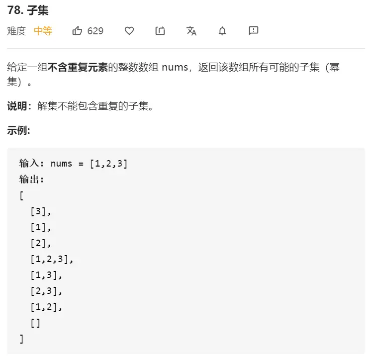 对于长度为n的数组,我们可以枚举所有长度为n的二进制串,并与数组元素进行与运算, 二进制串中的0表示子集不选这个数,1表示子集选这个数, 这样就直接枚举了所有的子集。