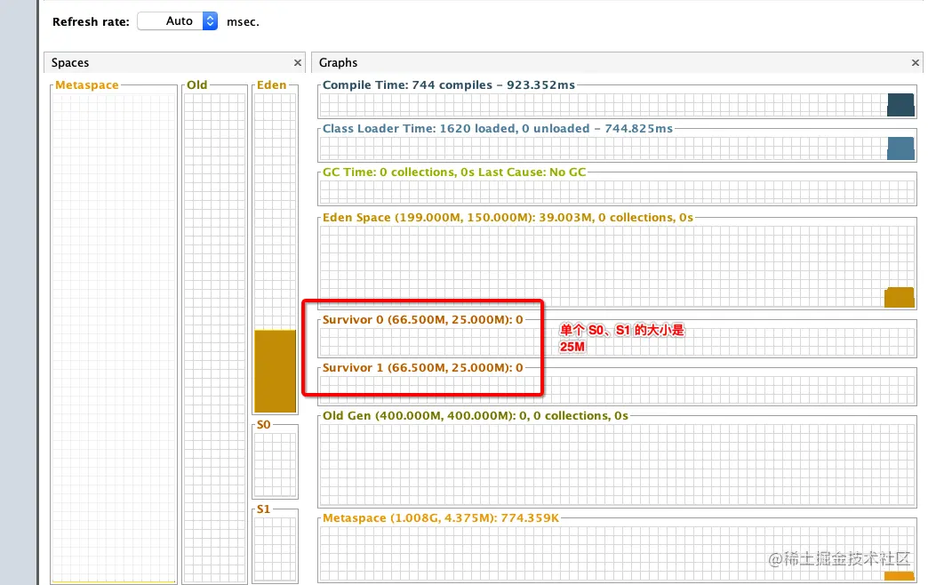 jvisualvm 截图看下,S0、S1 的大小是25M