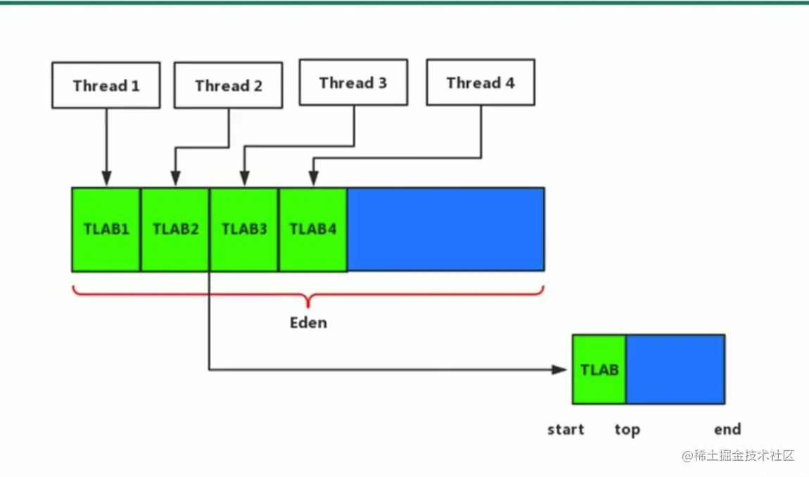 所以TLAB产生了,解决问题的最好办法就是消灭问题本身,不就是资源冲突嘛 ( ̄_, ̄ ) 那我们每个线程在堆内存中搞个私有空间不就行了,这一小块内存空间只给一个线程使用不就没有资源冲突了嘛,不就不用加锁了嘛,这种策略叫:快速分配策略