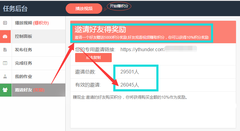 邀请一个好友送5000积分,并且好友观看视频赚取的积分竟然分给我10%奖励
