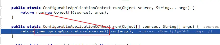 其中这一段代码:return (new SpringApplication(sources)).run(args);