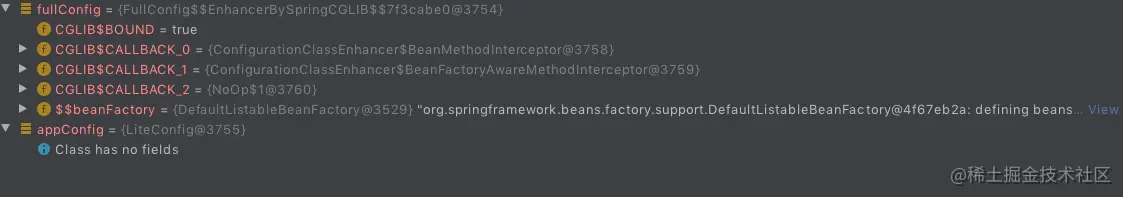 - full属性实例化的bean会被cglib增强,lite则是普通bean,如图一