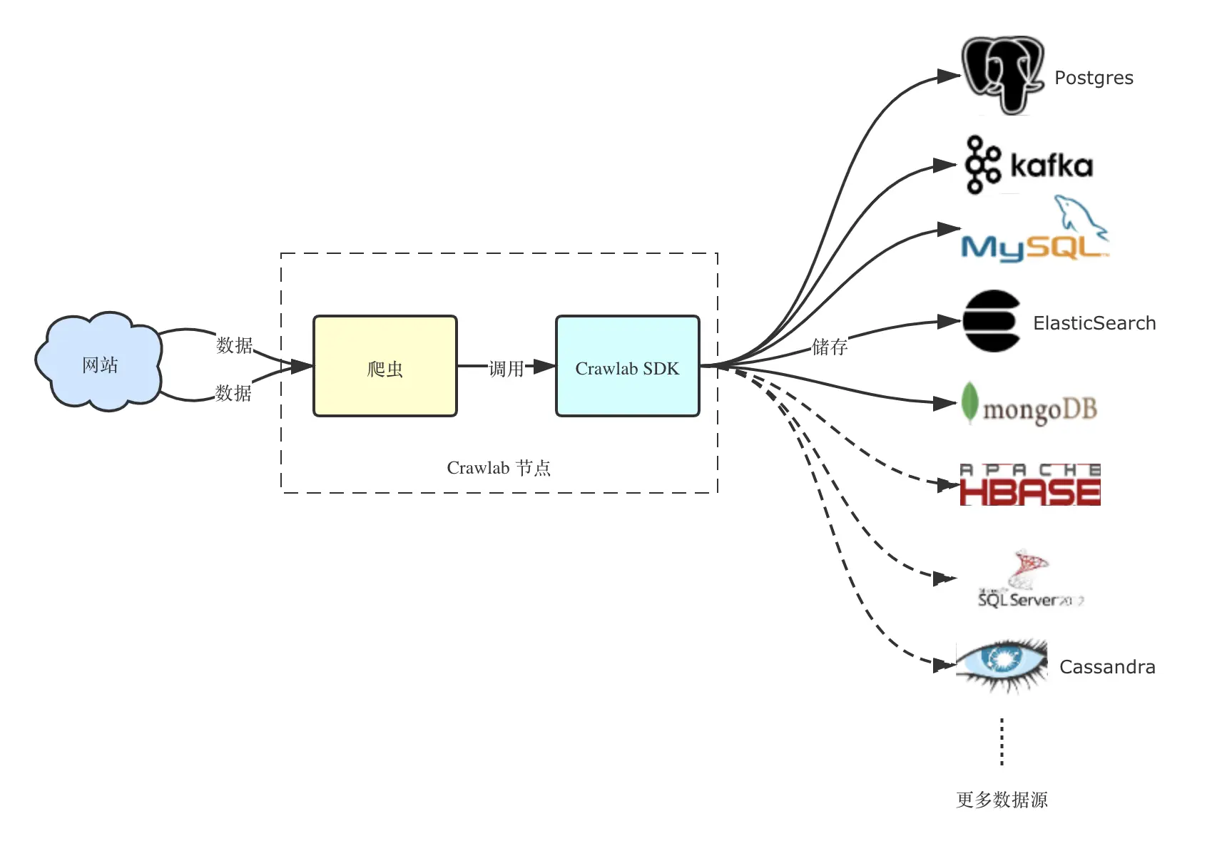 用户可以在 Crawlab 专业版上运行爬虫,将数据抓取下来,并通过调用 Crawlab SDK 来发送结果到指定的数据源中(如下图所示)。