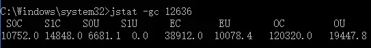 S0C:年轻代中第一个survivor(幸存区)的容量 (字节)S1C:年轻代中第二个survivor(幸存区)的容量 (字节)S0U :年轻代中第一个survivor(幸存区)目前已使用空间 (字节)S1U :年轻代中第二个survivor(幸存区)目前已使用空间 (字节)EC :年轻代中Eden(伊甸园)的容量 (字节)EU :年轻代中Eden(伊甸园)目前已使用空间 (字节)OC :Old代的容量 (字节)OU :Old代目前已使用空间 (字节)MC:metaspace(元空间)的容量 (字节)MU:metaspace(元空间)目前已使用空间 (字节)YGC :从应用程序启动到采样时年轻代中gc次数YGCT :从应用程序启动到采样时年轻代中gc所用时间(s)FGC :从应用程序启动到采样时old代(全gc)gc次数FGCT :从应用程序启动到采样时old代(全gc)gc所用时间(s)GCT:从应用程序启动到采样时gc用的总时间(s)