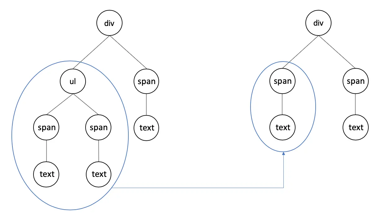 - 两个不同类型的元素会产生出不同的树