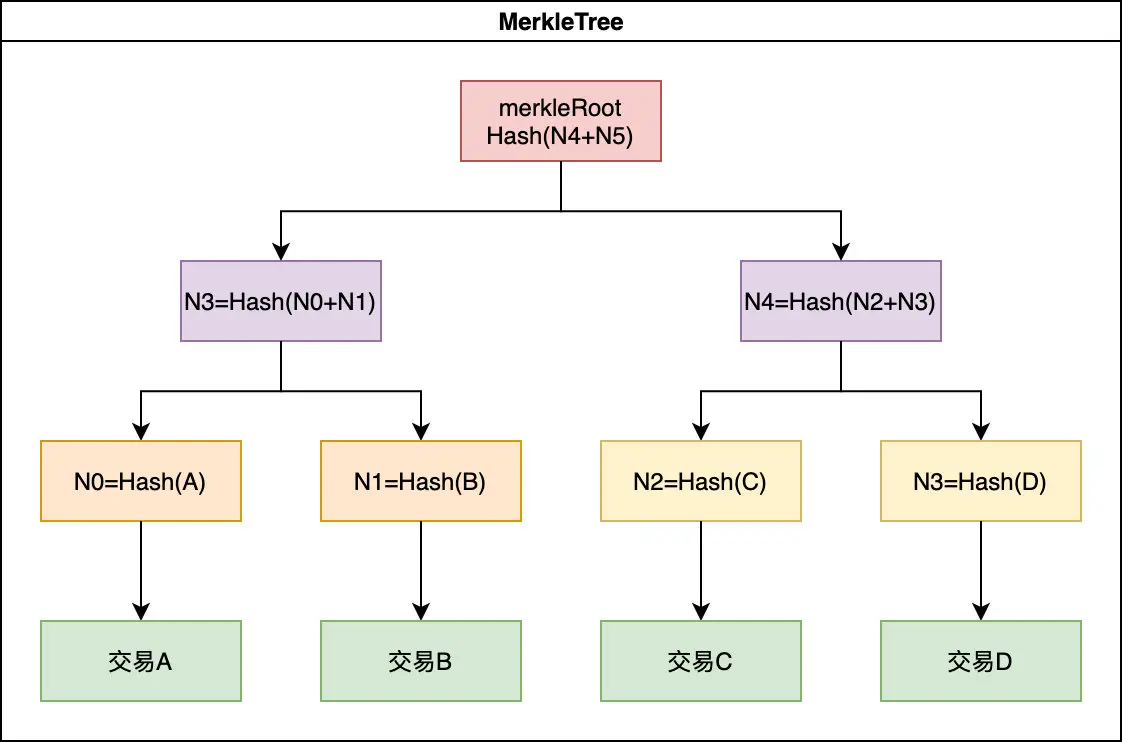 - 比较计算的merkleRoot与区块头的merkleRoot是否相同,相同则表明该交易A存在于此区块中。