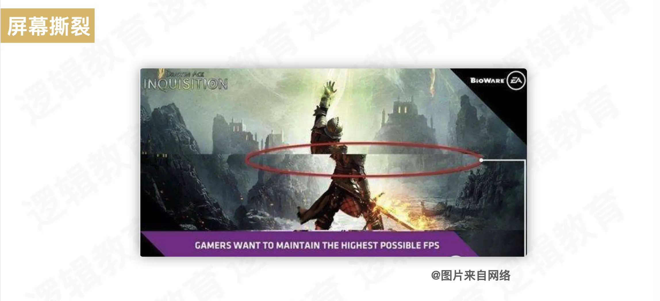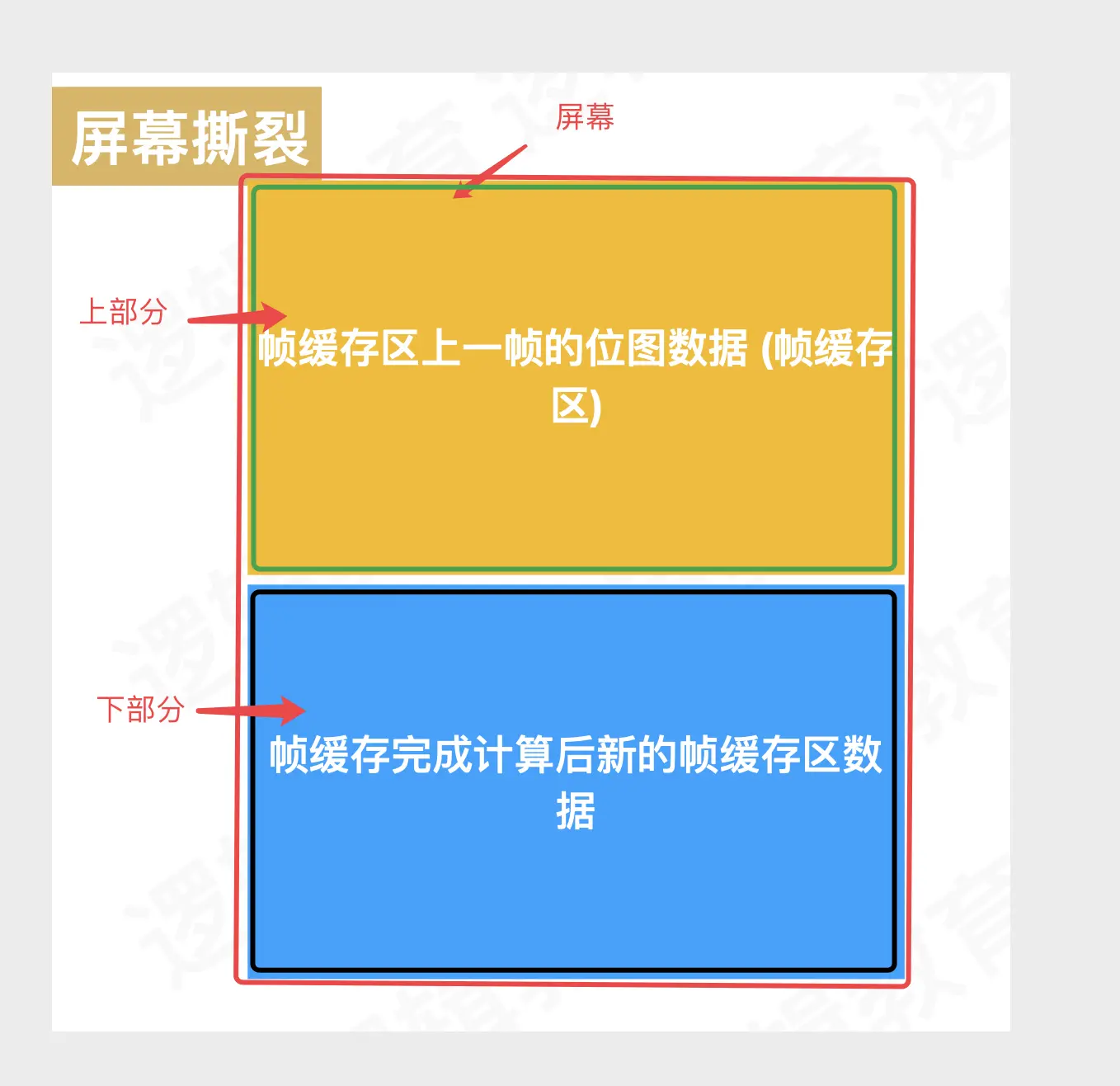 以上的流程会一直持续并快速的进行,当光栅扫描从缓存区读取数显示到显示器上时,如果一开始读取的是A图片,当扫描显示到中间的位置是,GPU将帧缓存区的数据进行了更新,此时帧缓存区的数据变成了B图片,那接下来继续扫描缓存区的图片显示到屏幕上的时间,读取的就是B图片,从而出现了一个屏幕上出现两个图片的现象,也就是上图出现的屏幕撕裂现象.