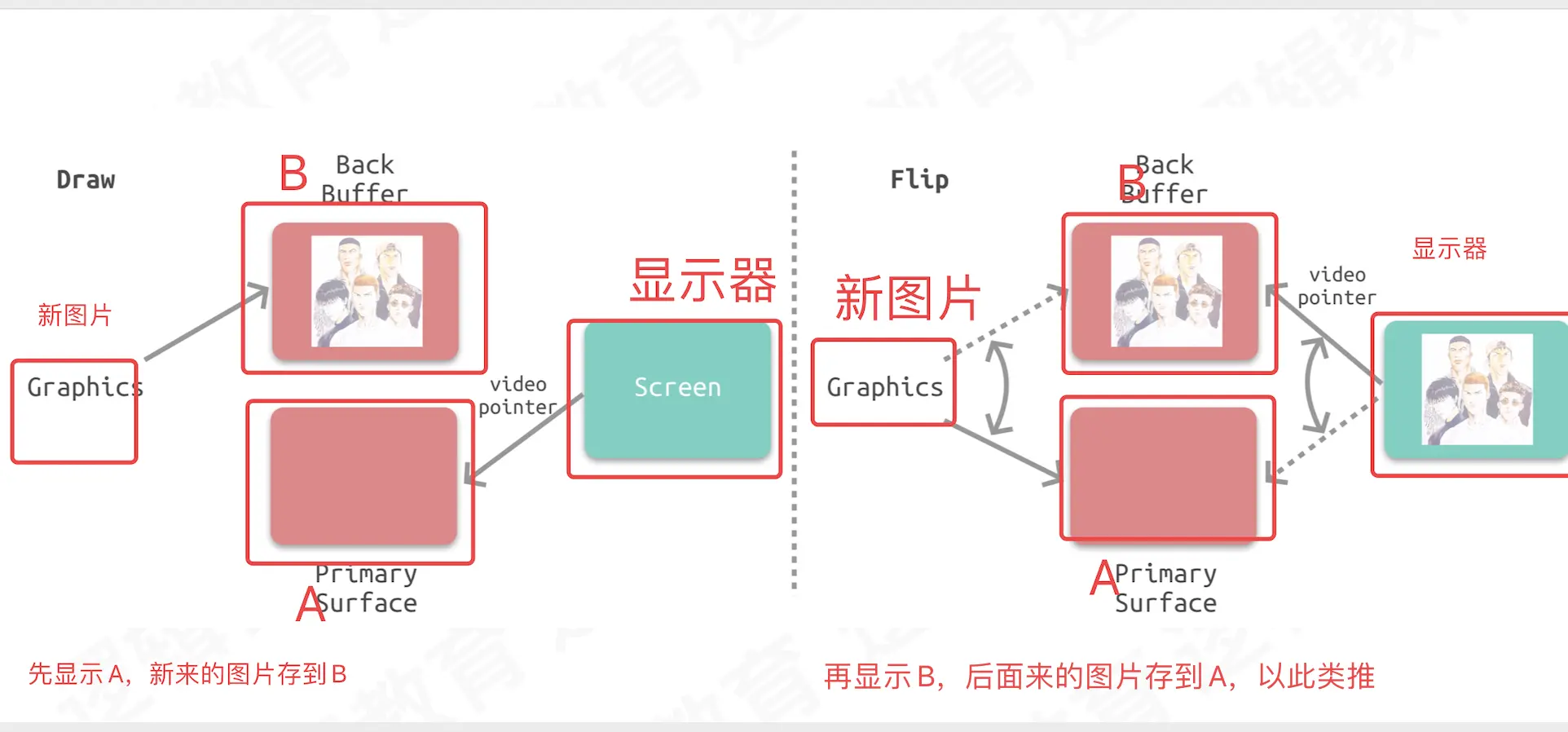使用垂直同步对帧缓存区加了锁以后,屏幕上的显示的图片虽然不会再出现撕裂的情况了,但如果在光栅扫描垂直同显示图片的过程中,GPU读取到了新的图片的数据,由于垂直同步对帧缓存区进行了加锁,新来的图片数据就无法存到帧缓存区中,就会导致数据的丢失,那怎么办呢?于是就有了双缓存区,我们假设两个缓存区分别叫A,B。当光栅扫描显示A缓存区的图片时,GPU新读取的图片就存到B中,当B显示时,GPU新读取的图片就存到A中...,这样就解决了屏幕卡顿的问题。