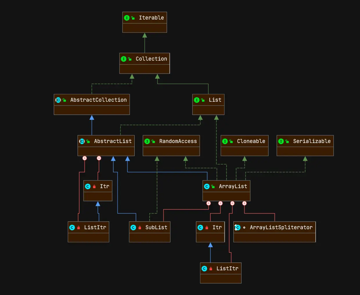 ArrayList有两个迭代器Itr和ListItr,ListItr在上面的图中可以看出是继承了Itr的。这篇优秀的文章
