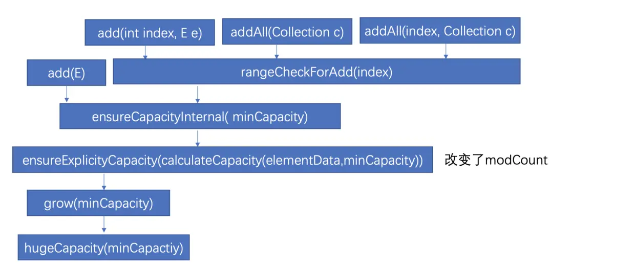 ensure相关方法都和扩容操作有关,minCapacity就是如果elementData容量不够大,就会最小扩容到这个大小,并且留意modCount的变化
