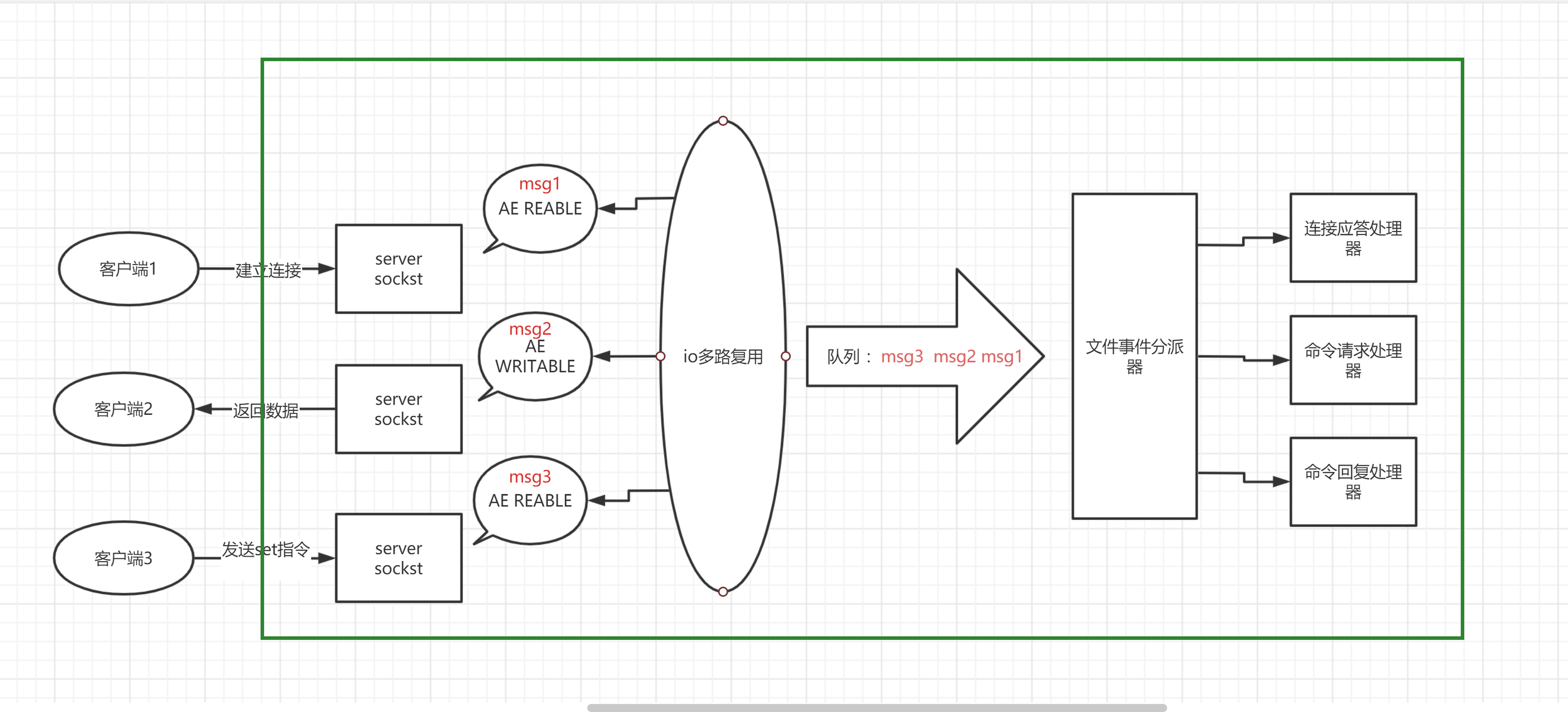 Redis内部与使用文件事件处理器file event handler,这个文件事件处理器是单线程的,所以redis才叫做单线程的模型。它采用的io多路复用机制(netty也采用这个机制)监听多个socket,将产生事件的socket压入到内存队列中,事件分派器根据socket上的时间类型来选择对应的事件处理器进行处理。