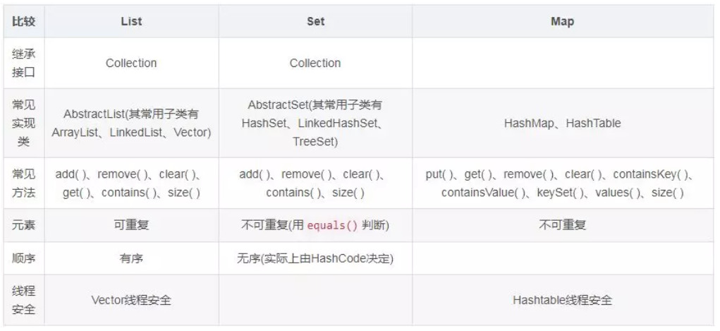 总共有两大接口:Collection 和 Map ,一个元素集合,一个是键值对集合; 其中 List 和 Set 接口继承了 Collection 接口,一个是有序元素集合,一个是无序元素集合; 而 ArrayList 和 LinkedList 实现了 List 接口,HashSet 实现了 Set 接口,这几个都比较常用; HashMap 和 HashTable 实现了 Map 接口,并且 HashTable 是线程安全的,但是 HashMap 性能更好;