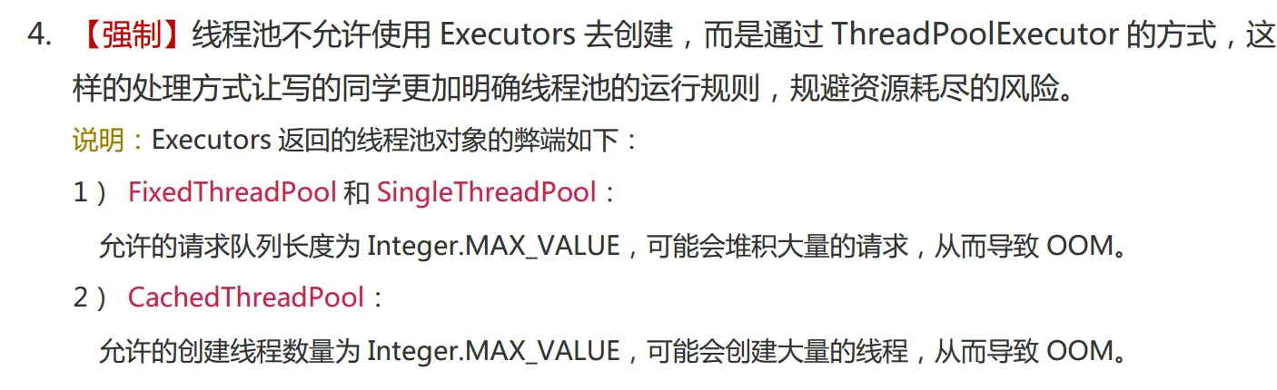 我们在上面的学习中使用 Executors 来创建线程池,但是实际工作中我们并不会这样做,需要自定义来创建线程池,如阿里巴巴开发手册中所提到的: