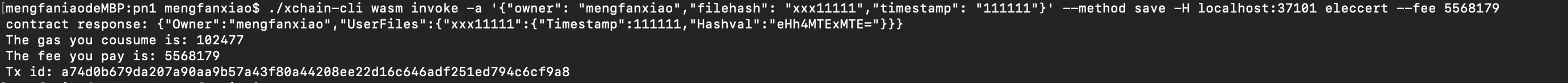 /xchain-cli wasm invoke -a '{"owner": "mengfanxiao","filehash": "xxx11111","timestamp": "111111"}' --method save -H localhost:37101 eleccert --fee 5568179