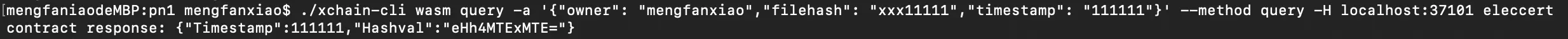 ./xchain-cli wasm query -a '{"owner": "mengfanxiao","filehash": "xxx11111","timestamp": "111111"}' --method query -H localhost:37101 eleccert
