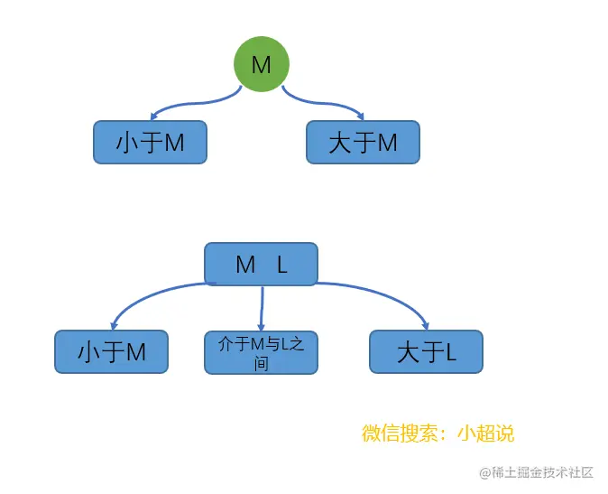 - 3-节点,含有两个键(及其对应的值)和三条链接,左链接指向的2-3树中的键都小于该节点,中链接指向的2-3树中的键都位于该节点的两个键之间,右链接指向的2-3树中的键都大于该节点。