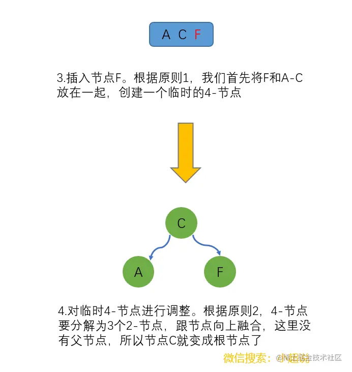 原则2. 如果出现4-节点,要将它分解成三个2-节点组成的树,并且分解后新树的根节点需要向上和父节点融合(父节点变成3-节点或者4-节点)