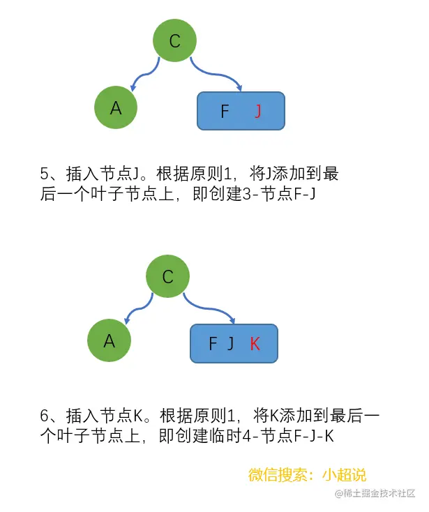 原则1. 加入新节点时,不会往空的位置添加节点,而是添加到最后一个叶子节点上(使2-节点变为3-节点,3-节点变为4-节点)