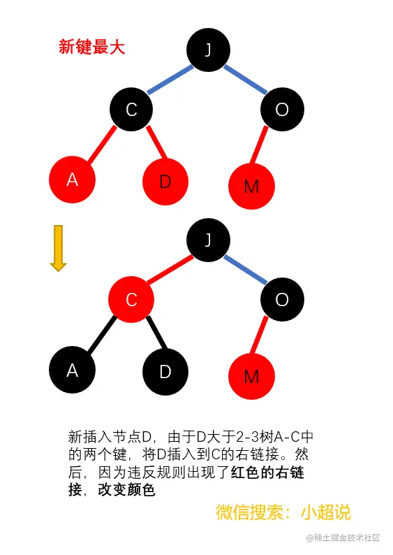 我们只是将用两个键中较小的那个作为根节点改变为将较大者作为根节点,代码的实现还是比较容易的,结合上图理解更轻松。