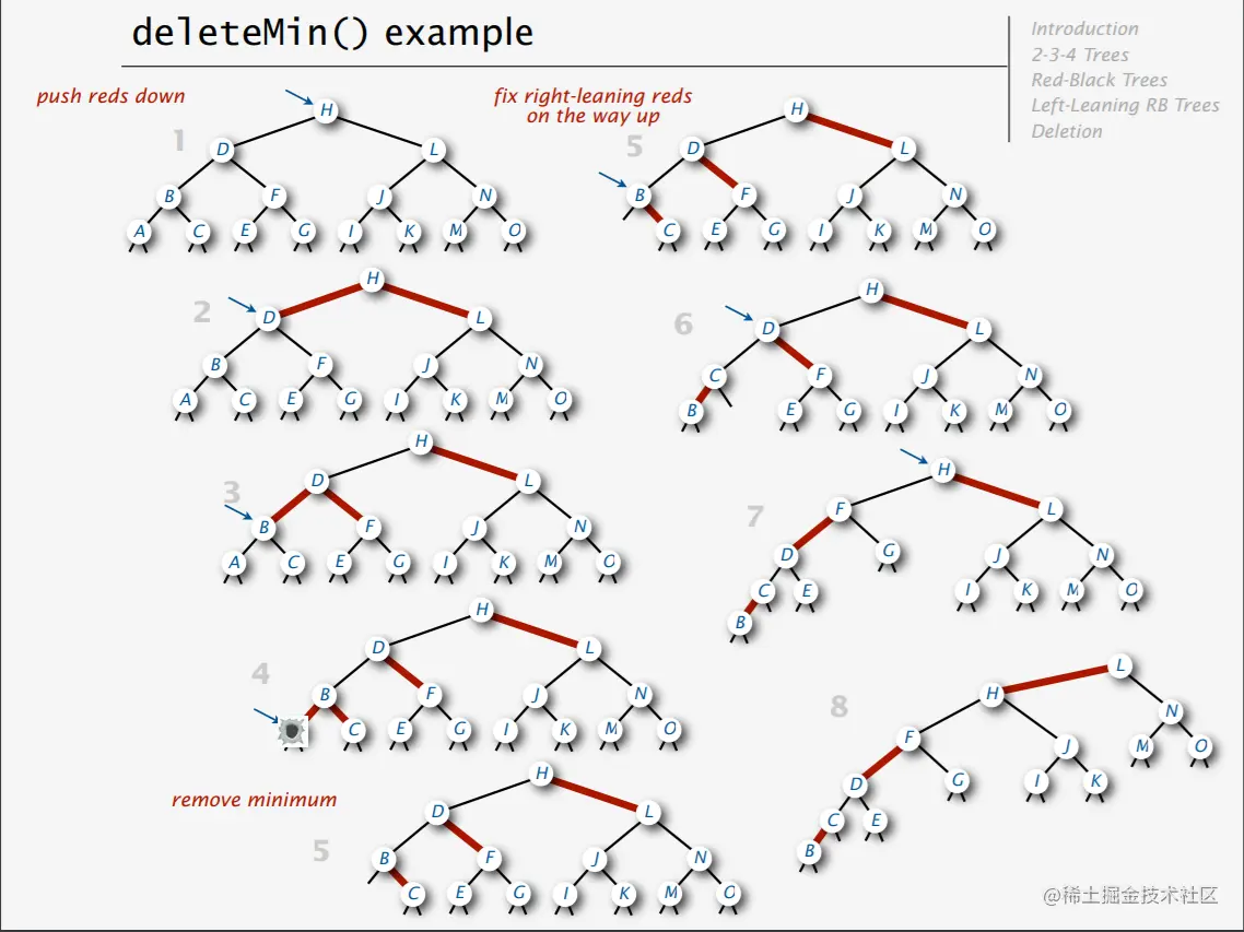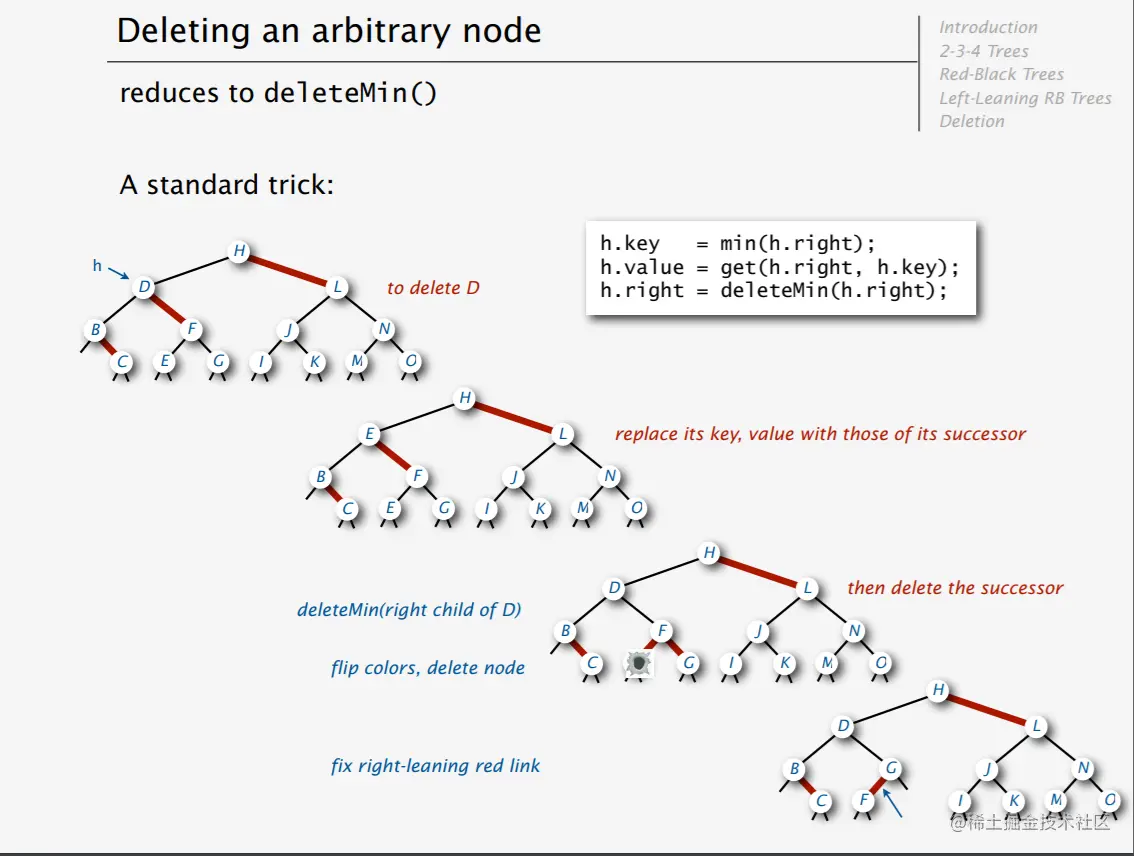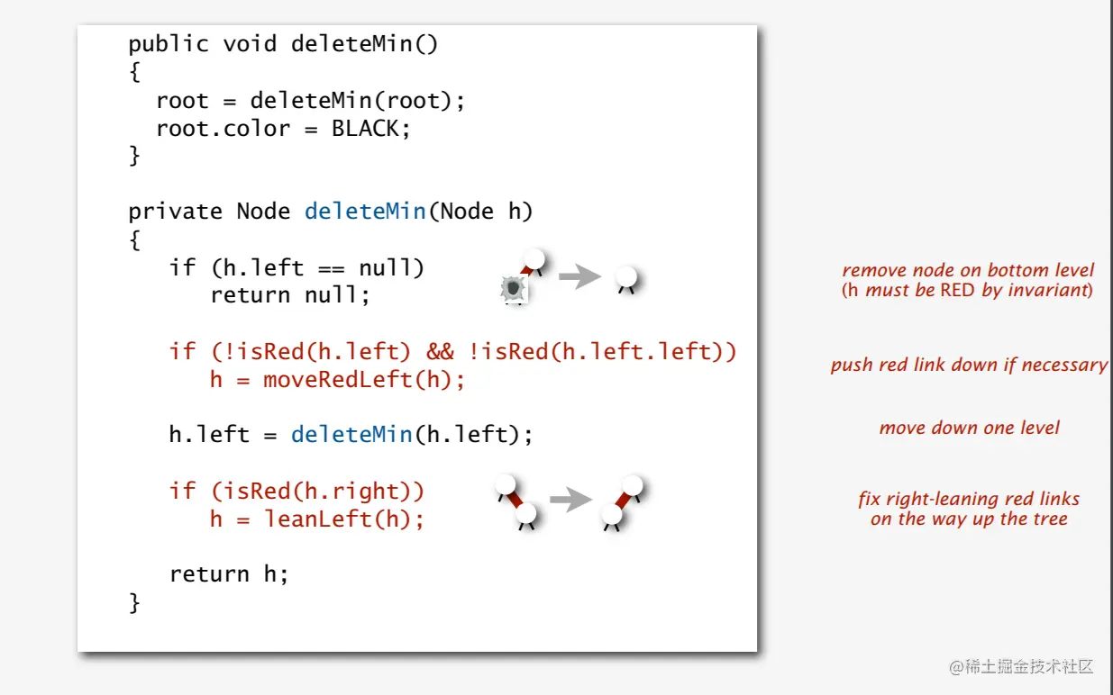 对于第2条,如果结束于3-节点或者4-节点,说明最小键是红节点,直接删除红节点不会改变红黑树的性质。第三条说的就是解决方案,我们通过一些调整使得最小键处于一个3-节点或4-节点上。