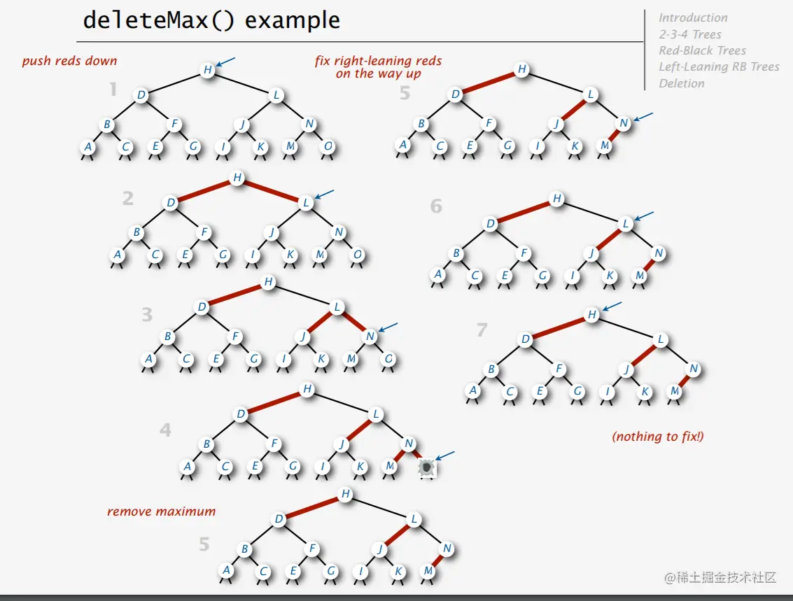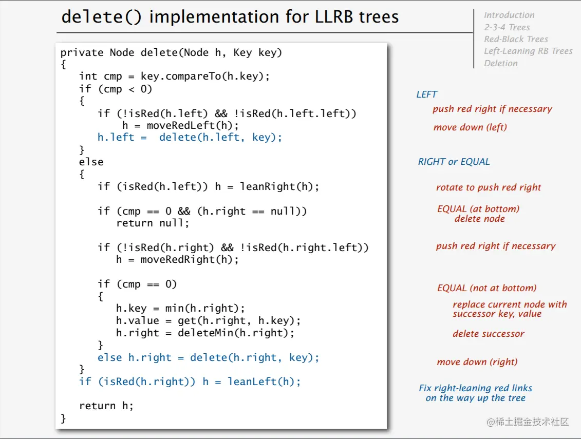 总结一下,我们的删除最大键和删除最小键的算法,其实是结合2-3-4树的一些性质,在删除之前通过一系列操作为删除创造条件,而这个条件一旦满足后,我们就可以在不产生任何后果的情况下进行删除操作。删除前的一系列铺垫小超这里觉得实在是巧妙😲,我觉得,你根据后面的这些配图和代码应该可以理解他的思路,毕竟,情况不多!左倾红黑树(LLRBTree)大大减少了需要分类讨论的情况。这是一项伟大的发明!