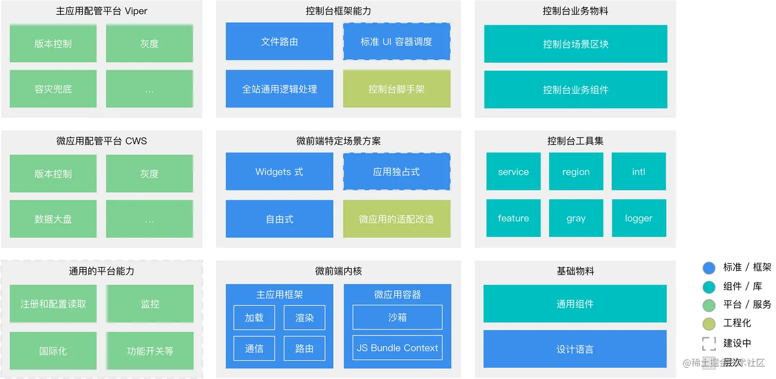 注意到,其中左栏是平台(配置、管控)相关能力,上层是阿里云控制台侧的一些解决方案包装……即是说,大半的工作是贴着业务建设的。对于不同 BU 的团队来说,这些需要根据自己所在业务的特性来定制对应的方案。 而中间下层的「微前端内核」部分,则偏「纯技术」,几乎可以在任何(基于微前端的)业务场景下通用,这部分也更容易让没有阿里云业务概念的读者理解。