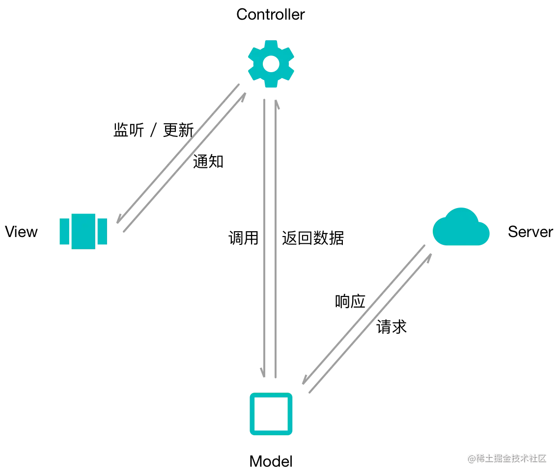 在十多年前,经典的 MVC 应用架构在后端大行其道,人们(包括我)自然地想在前端中也实践这一点。 当时按照 MVC 构建后的各个角色形如上图。其中,Model 和 View 这两层比较容易拆解,各自的代码表征也很明确,但是 Controller 部分怎么写都觉得不优雅 —— 必须在其中编写大坨的胶水代码,才能保证页面状态的正常运转。