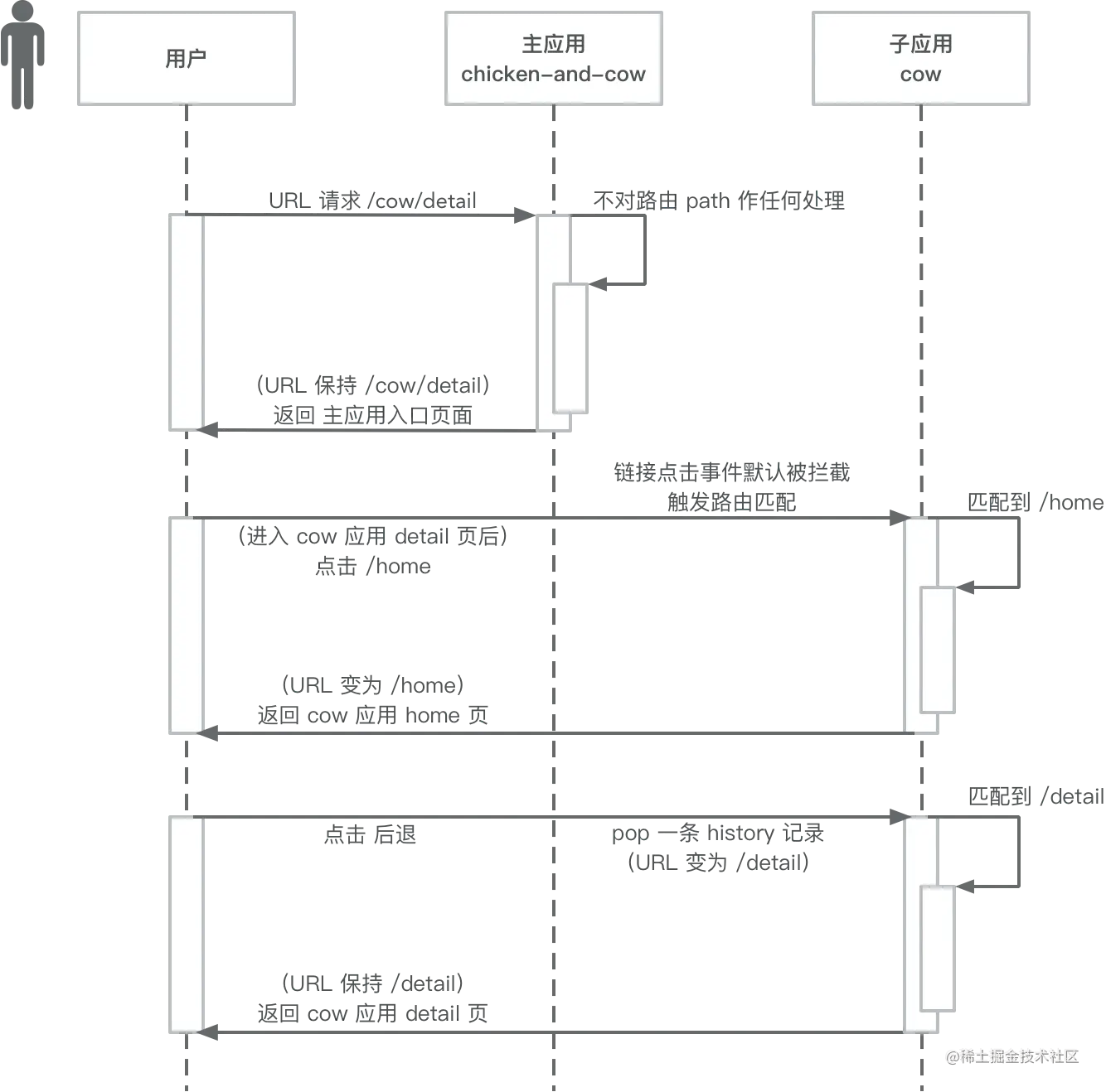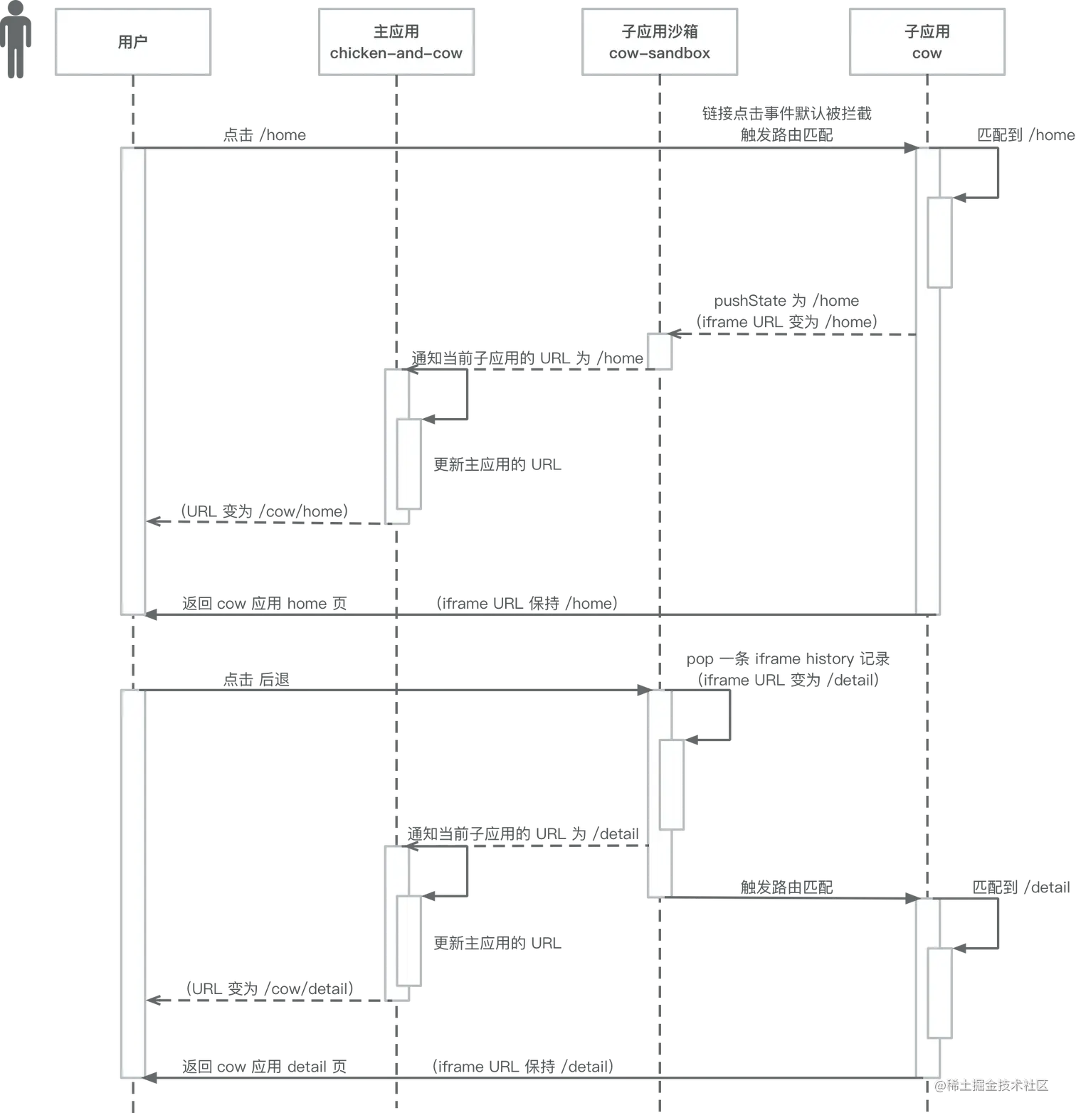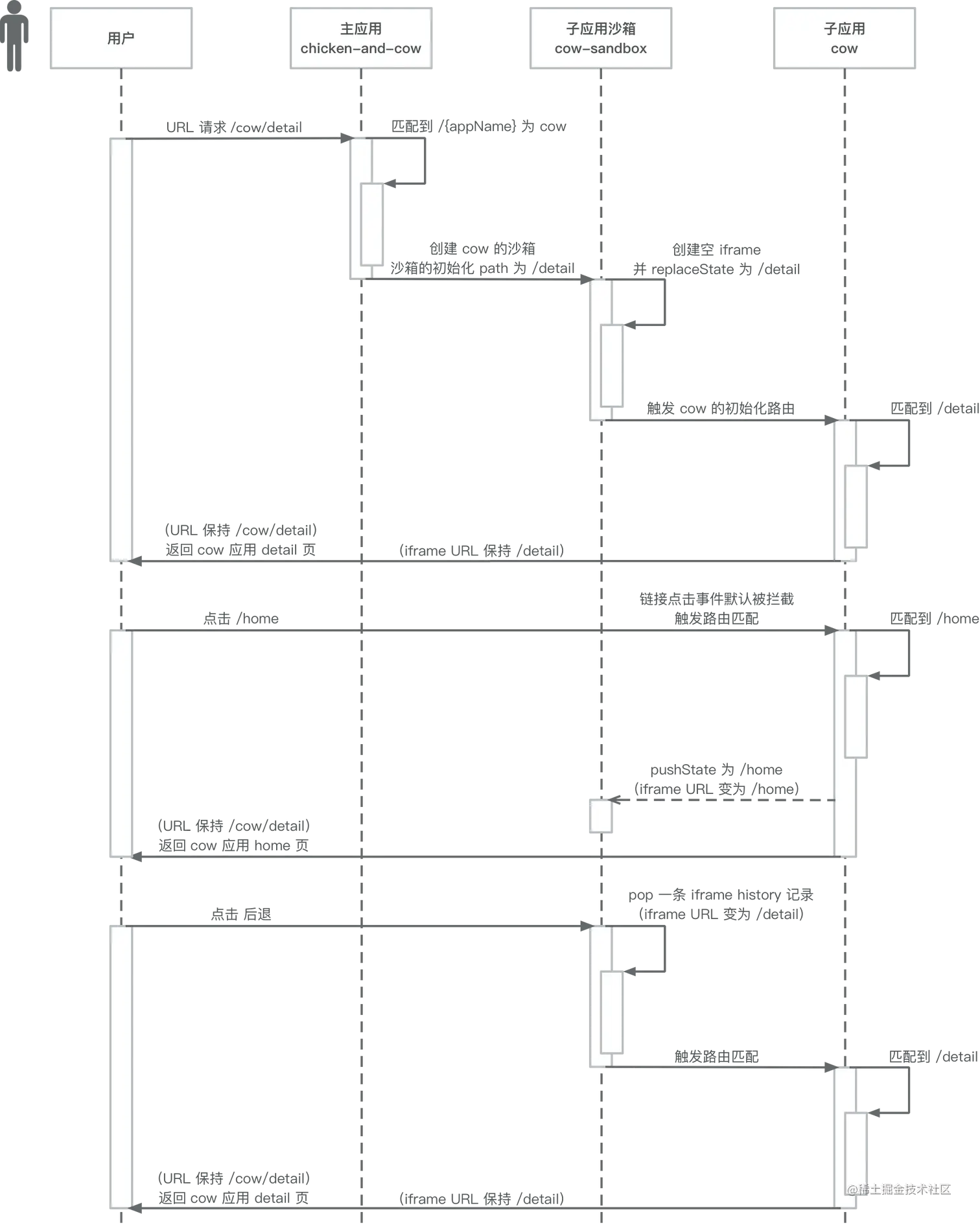 返回 cow 应用的 detail 页面。 - 子应用内部的路由切换后,主应用的路由也同步变化。比如 cow 应用回到首页后,浏览器地址栏将显示