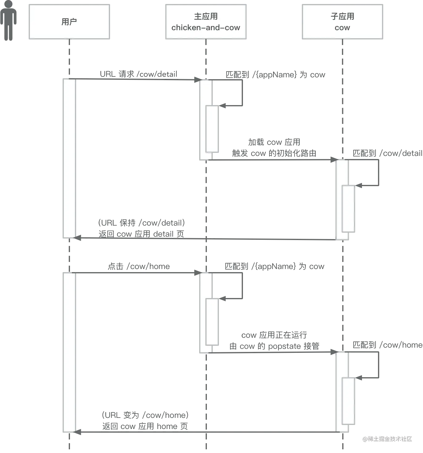 那何谓「正确的主子路由逻辑」? 不管具体的实现手段如何,我们希望主应用在集成了子应用之后,最终达到如图的效果: 我们虚构了一个主应用叫做 cow-and-chicken,它会集成 chicken 和 cow 两个应用,通过 tab 来切换。默认情况下,主应用会指向 cow 应用,并且,遵循如下的路由效果: