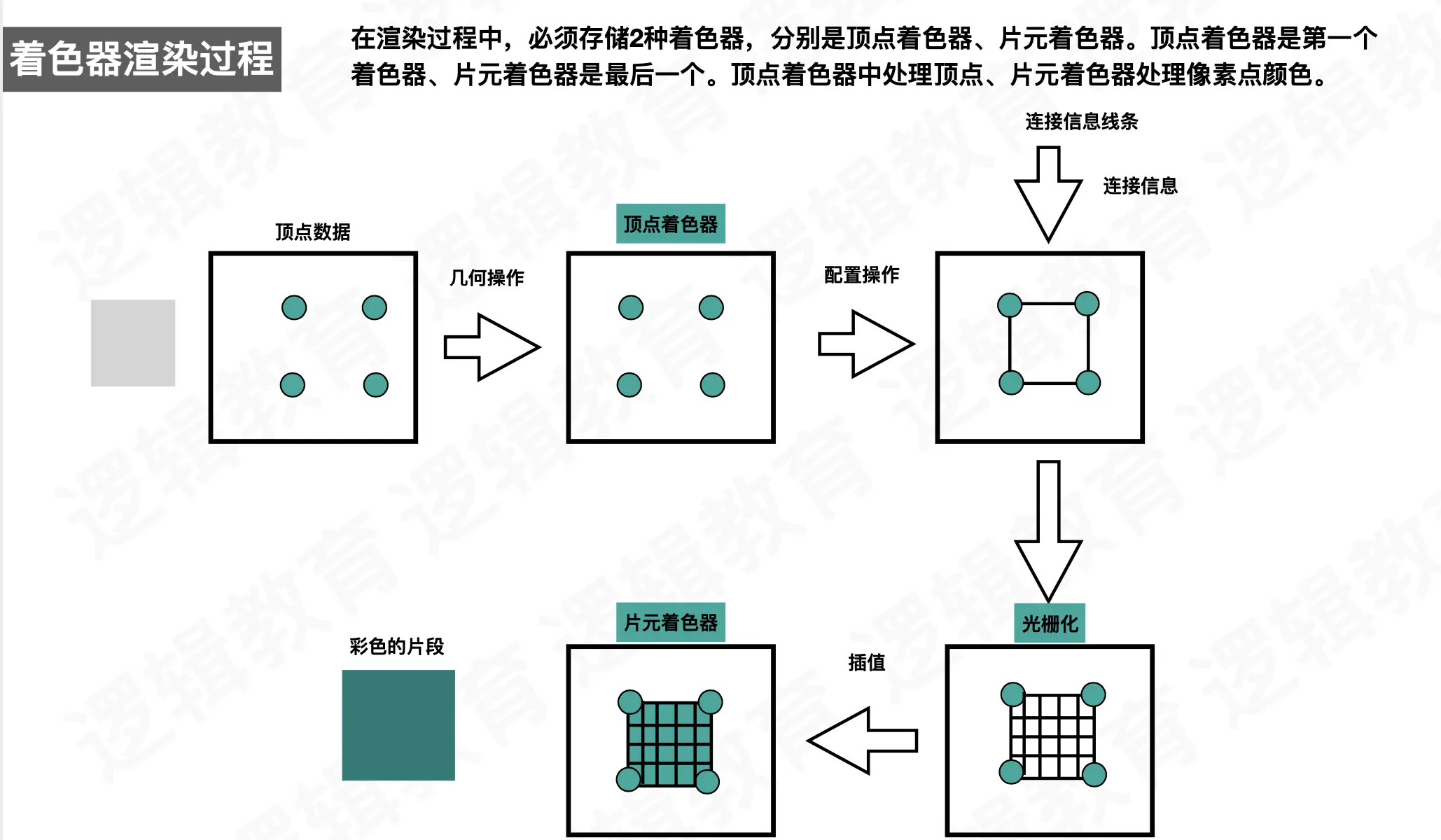 当图片在屏幕上显示时,首先我们先通过frame,获取到顶点数组,将顶点数据通过"顶点着色器"进行处理,以点、线或三角形的形式进行顶点的连接;然后通过光栅化,并使用“片色着色器"将图片的像素点渲染到顶点数据所框住的区域内。