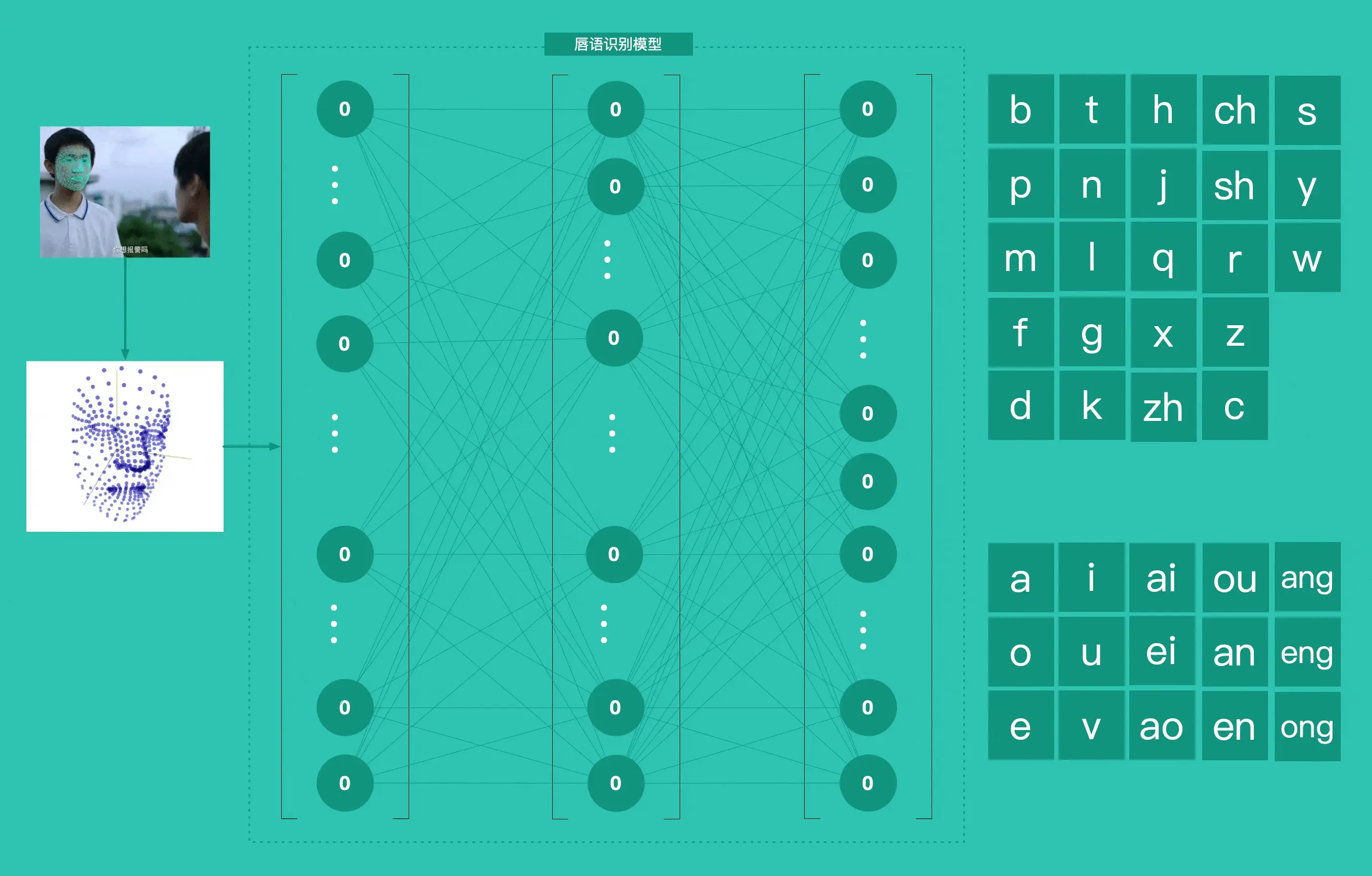 这个案例中的模型我选使用基于 Tensorflow 的 Facemash 模型进行二次训练。Facemash 的主要作用是获取面部表情的特征。之后通过分析嘴唇的运动特征,来预测出说话内容的汉语拼音的声母和韵母。(直接通过嘴型预测汉字难度太大,所以我要先预测出拼音,之后再根据剧情+拼音还原出原对话)