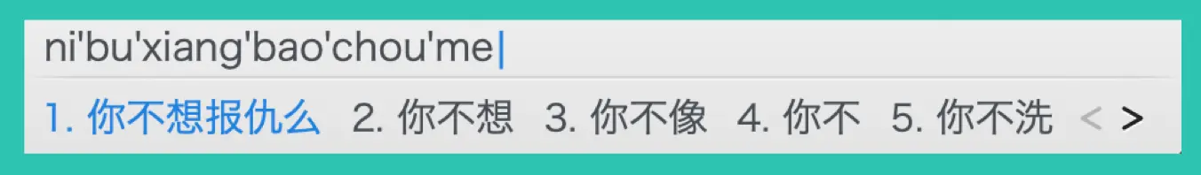 这些拼音翻译过来是啥呢?我把每组拼音用输入法测试了一遍,发现 「ni bu xiang bao chou me」这句的结果与剧情最贴切:「你不想报仇么?」
