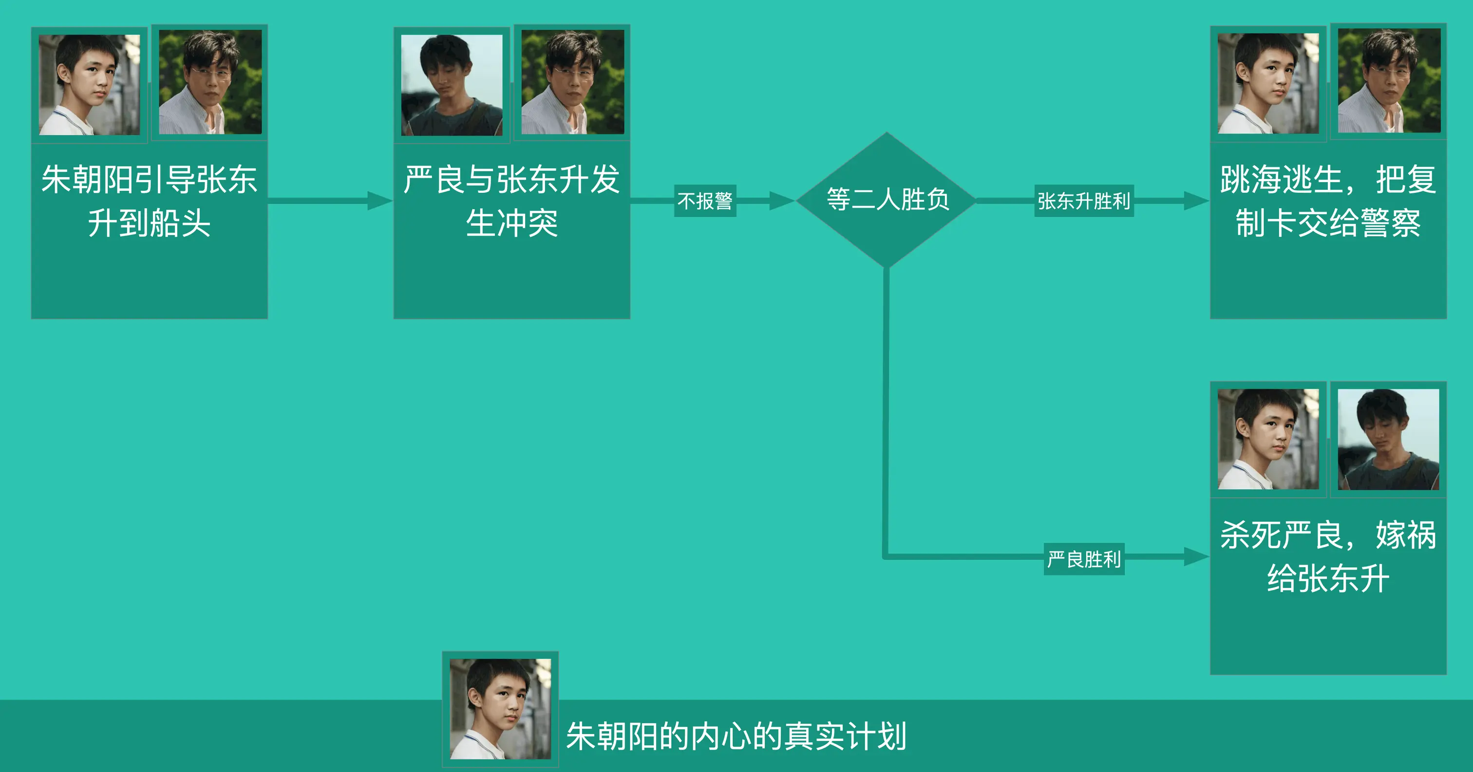 1.引导张东升与严良见面发生冲突(自己并不报警,后面警察来了之后朱朝阳的表情是震惊的,因为并不是他报警的) 2.如果胜利回来的是严良,那么他就会乘其不备杀死严良(朱朝阳和严良学过打架),然后嫁祸给张东升 3.如果胜利回来的是张东升,那么他就会跳进大海逃生(朱朝阳一直在练习憋气),然后把复制卡交给警察 分析到这里,朱朝阳的内心的阴暗已经不忍直视。可能这也正是「隐秘」剧组原本想要呈现的坏小孩,就像原著小说「坏小孩」里说的那样**「在成年人眼里,小孩子永远是简单的。即使小孩会撒谎,那谎言也是马上能戳穿的,他们根本想象不到小孩子的诡计多端,哪怕他们自己也曾经当过小孩。」**