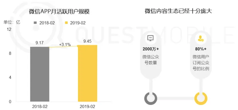 微信公众号实际上依托于微信本身的流量,2019 年微信的月活用户已达到 11 亿,同年,全国 4G 用户数为 12.8 亿户。微信在中国的用户覆盖程度极高,移动互联网中大概有 90% 的用户都是微信用户,微信拥有着羡煞旁人的流量优势。