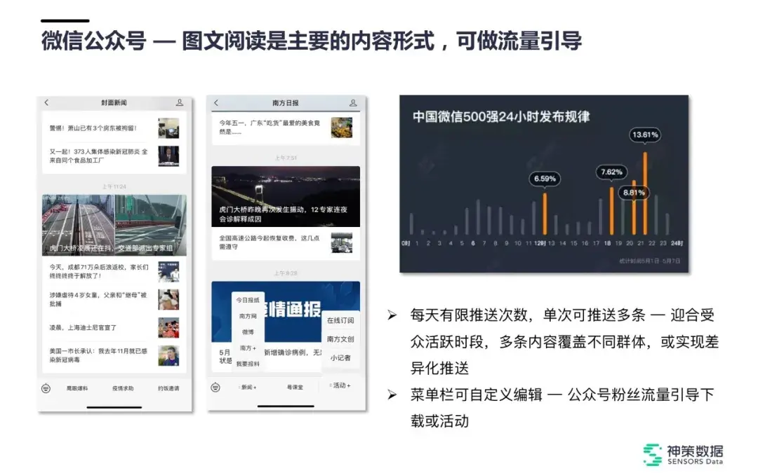 微信公众号菜单栏可自定义编辑,意味着可以把微信公众号里的流量尝试导流到自己的 APP 上。虽然在微博和今日头条等平台基本上不允许做二次流量引导,但在微信公众号的菜单栏内,我们可以去设计一些活动的引导,实现引流。