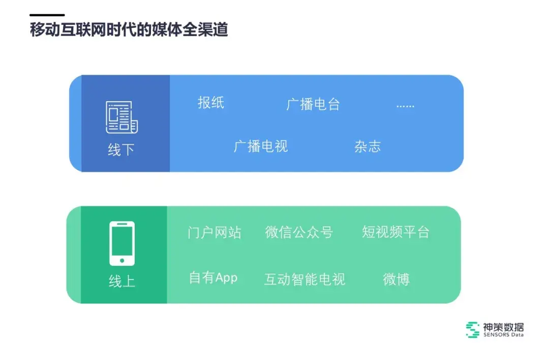 移动互联网时代,媒体全渠道分为线上线下两类,线下包括报纸、广播电视、广播电台、杂志等,线上包括门户网站、微信公众号、短视频平台、自有 APP、互动智能电视、微博等。