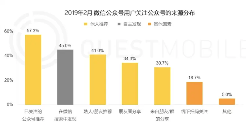 但我们也发现,其中有 45% 的用户是通过自己主动搜索去发现公众号。比如某位用户想关注人民日报的时候,就会在微信里面搜索人民日报,然后去关注公众号。实际上,当他在进行搜索的时候,就对于目标公众号有了一个较为明确的认知。所以,当某个平台或品牌已具备明显的品牌效应时,也更容易在微信中获得流量。