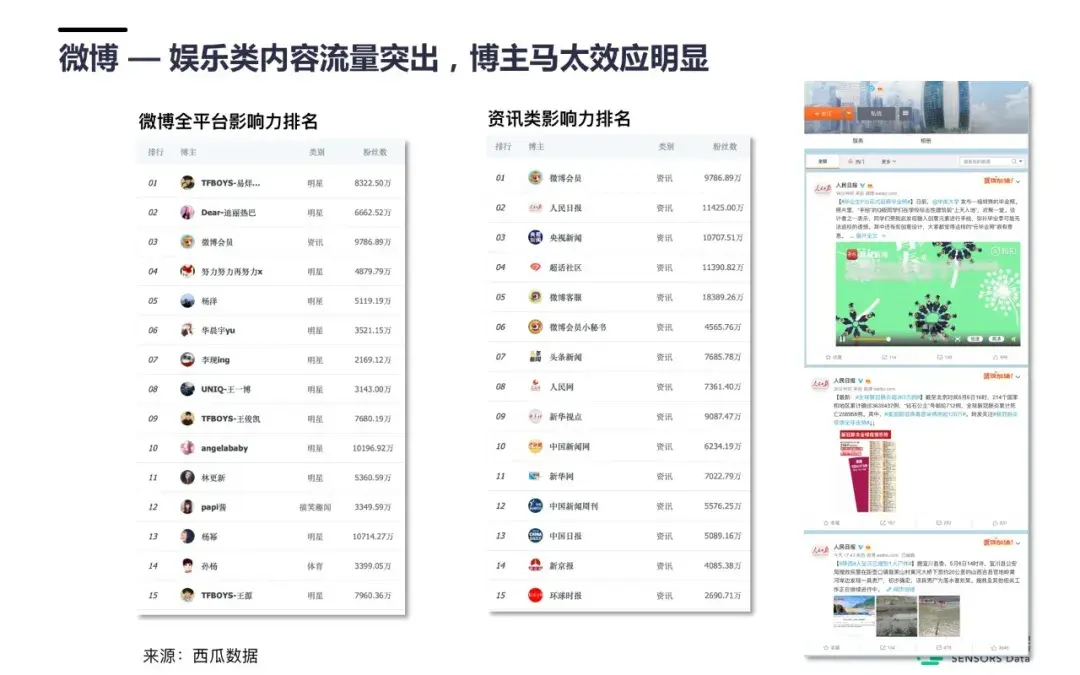 微博可能是继微信之后在中国的第二大网络社区,其突出的特点是娱乐性质非常强。在微博全平台影响力排名前 20 的博主里,明星类博主占比 70%——80%。