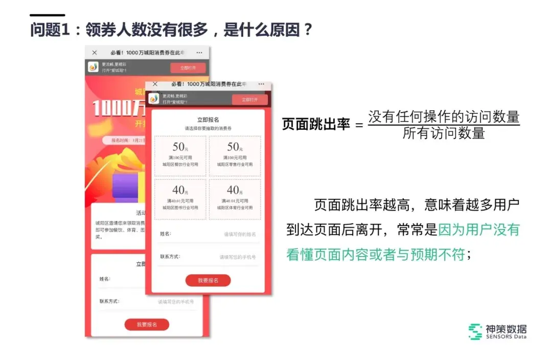 页面跳出率越高,意味着越多用户到达页面后离开,常常是因为用户没有看懂页面内容或者与预期不符。比如当用户来到页面之后,什么优惠券都没看到,只是被要求填姓名和手机号,自然很多用户就不愿意填了,因为他们不知道填完之后能获得什么。